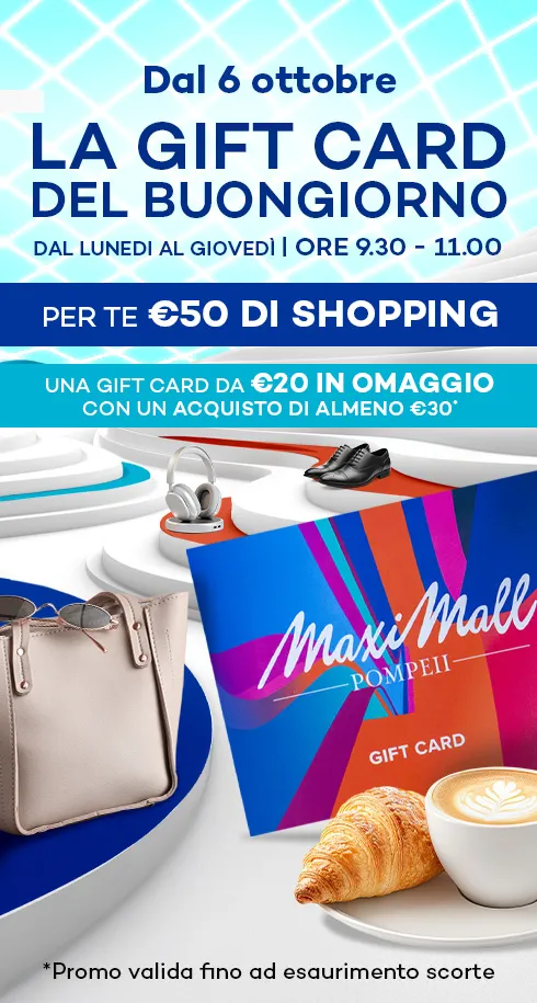Dal 6 ottobre 2025, per ogni acquisto di almeno € 30,00 effettuato presso i punti vendita del Centro Commerciale MaxiMall Pompeii, il cliente riceverà in omaggio una Gift Card da € 20,00.