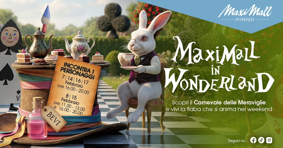 Al MaxiMall Pompeii arriva MaxiMall in Wonderland dove ogni angolo racconta una storia: dagli allestimenti da favola che ti accolgono all’ingresso, fino ai dettagli più curiosi che scoprirai passeggiando tra le installazioni. E non finisce qui: ogni weekend, il Carnevale prende vita con personaggi sorprendenti che ti faranno entrare nel cuore della magia. Incontra Alice, il Bianconiglio, il Cappellaio Matto, e i divertentissimi Pincopanco e Pancopinco, pronti a giocare, divertirsi e regalare sorrisi a tutta la famiglia .