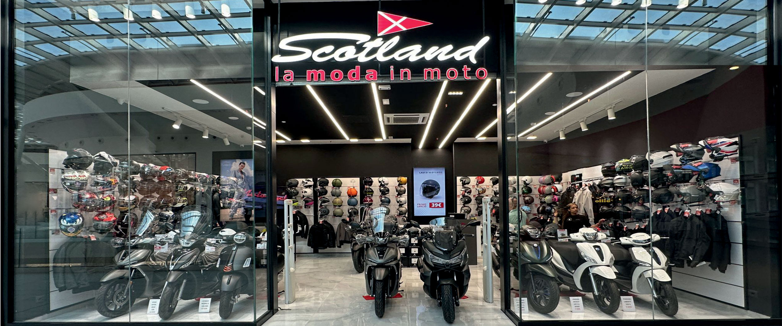 Lo Scotland Store situato al primo piano della galleria commerciale: offriamo una vasta gamma di abbigliamento, caschi e accessori dei migliori brand per il motociclista, oltre ad una vasta esposizione di scooter e moto, nuove e usate. Effettuiamo finanziamenti a tassi agevolati e preventivi assicurativi con Motoplatinum alle migliori tariffe del mercato, anche con furto e incendio.